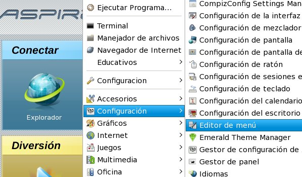 Clic-derecho sobre el escritorio para abrir el menú ampliado, elegimos Configuración y Seleccionamos Editor de Menú.