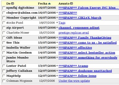 La lista de mensajes que aparece en la imagen siguiente son todos spam. Observa como se le han escapado unos pocos y cómo ha modificado las cabeceras (añadiéndole ***SPAM***) de los que ha detectado.