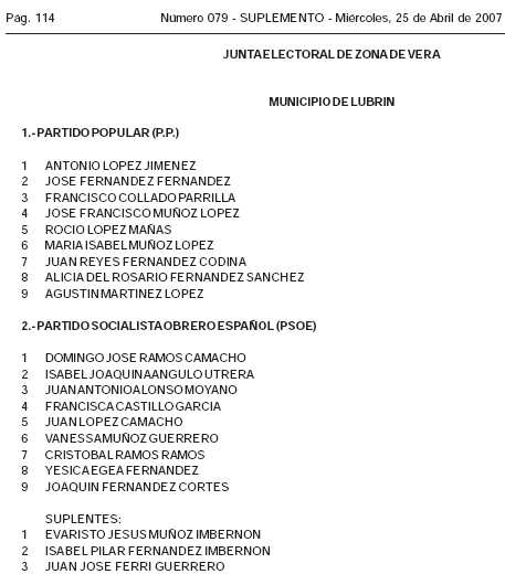 Sin hacer caso a la rumorología (debería ser una ciencia si aún no lo es) y guiándome por fuentes oficiales (Boletín Oficial de la Provincia) las candidaturas presentadas en Lubrín son las siguientes: