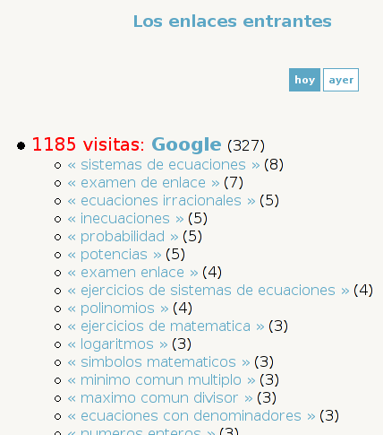 En este caso particular vemos que de las 1549 visitas recibidas hoy, 1185 provienen de Google. Y no sólo que provienen de Google .. sino que nos informa sobre lo que buscaban en Google para que el buscador les ofreciera un link a Matemáticas IES.