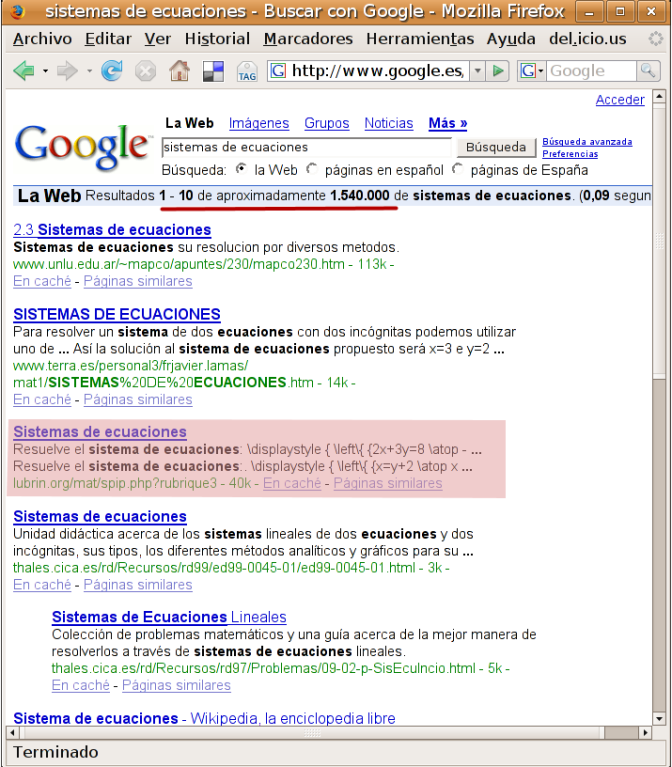 Vemos que 8 visitas teclearon la cadena « sistema de ecuaciones » y google les mostró mi página entre los resultados.