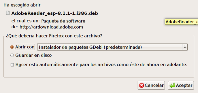 Ahora veamos si funciona: Nos vamos al menú Aplicaciones / Oficina / Adobe Reader y nos aparece el siguiente mensaje: