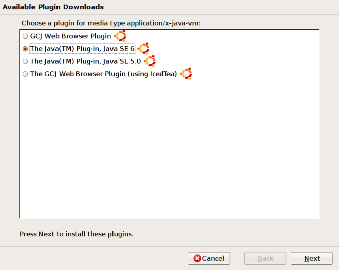 Java: no está instalado. Al entrar en la primera página que use un applet de Java nos pregunta que plugin queremos usar: