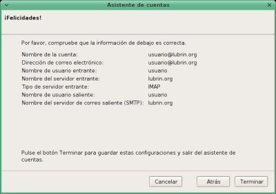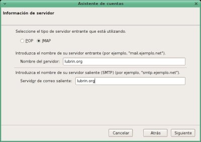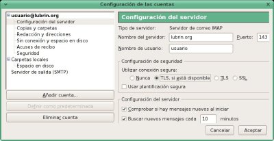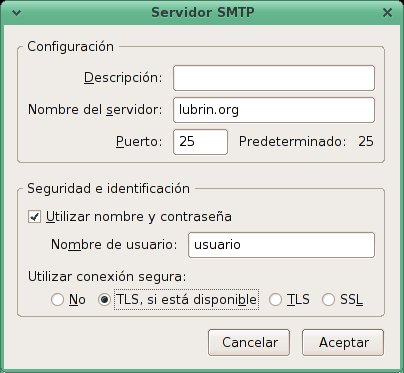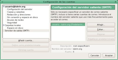 Es posible que ya tenga configurado un servidor de salida (SMTP) en caso de que ya tuviese otras cuentas. Déje el que tiene y compruebe si también envía los correos de la cuenta lubrin.org. Si se niega, pruebe a cambiar el servidor SMTP por lubrin.org (aunque puede que lubrin.org también se niegue a enviar correos que no sean de lubrin.org).