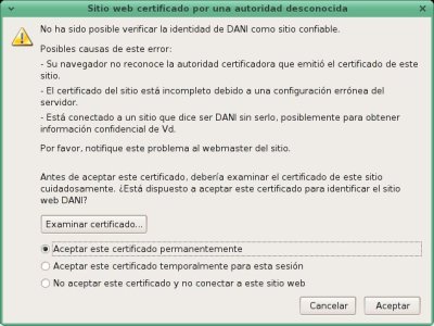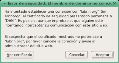 La primera vez que conectemos veremos los tradicionales mensajes del certificado de seguridad, que como verá no están emitidos por Hacienda (como cuando hacemos la rena por internet), sino por DANI (lubrin.org), pero son igual de seguros.