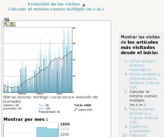 Aparece la evolución de las visitas al artículo Calcular el mínimo común múltiplo (m.c.m.) con todos los datos que vimos anteriormente .. aunque son sólo referidos a un artículo.