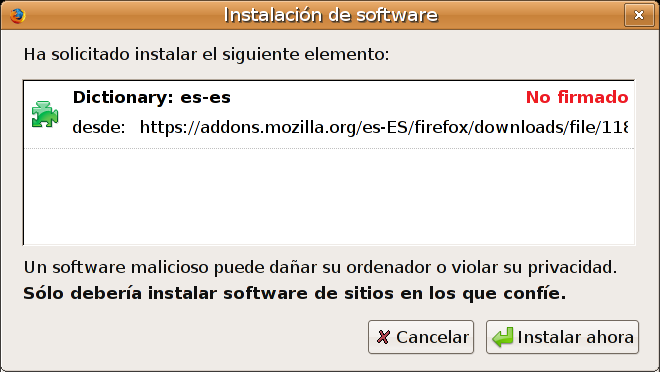 Lo he reinstalado varias veces. El navegador esta configurado en castellano. El único inconveniente que veo es que utilizo Debian y por lo tanto Icewasel, pero ya te digo, otras extensiones funcionan bien y esta funciona, pero en inglés.