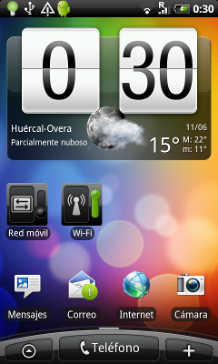 El escritorio principal suele incluir los widgets del tiempo y de la hora. El del tiempo, mediante geo-localización averigua en qué ciudad estás y te ofrece el tiempo y las previsiones para esa ciudad. Sin embargo, es personalizable (como el resto de escritorios) y podemos añadir o quitar widgets o programas, tantos de los que trae por defecto, como de los que descarguemos gratuitamente del Android Market (también los hay de pago), o incluso de los que programemos nosotros mismos.