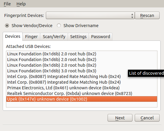 – 5) Seleccionamos el dispositivo (busca algo que lleve UPEK) y pasamos a la siguiente pestaña pulsando Next.
