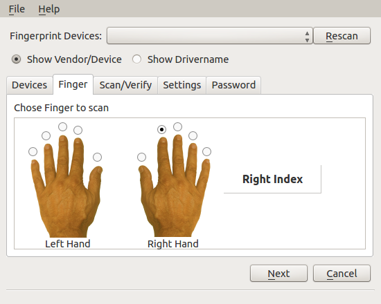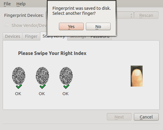 – 7) Volvemos a pulsar Next y ahora nos grabará la huella del dedo elegido. Te pide que pases el dedo varias veces (en ubuntu 12.04 me lo ha pedido 3 veces y en la versión 13.04 me lo ha pedido 5 veces). También tienes la opción de grabar el archivo donde comparará tus huellas en un pendrive u otro dispositivo externo (no recomendable según el enfoque de este artículo).