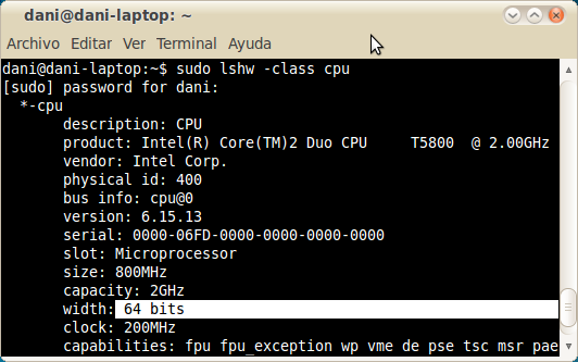 Para averiguar los bits a los que funciona tu CPU tan solo tienes que teclear en un terminal la siguiente línea de código