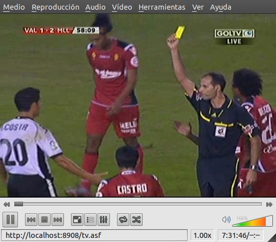 – Recomiendo usar VLC. Para ello en el menú "Medio" seleccionamos "Abrir volcado de red" y tecleamos http://localhost:8908/tv.asf