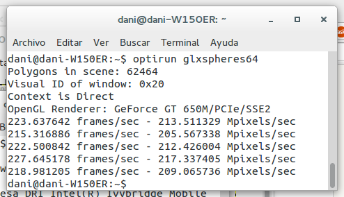 optirun glxspheres64(ahora lo hace con la nvidia)