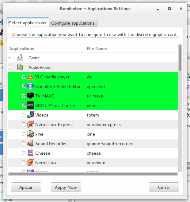 Si queremos configurar qué aplicaciones usarán la nvidia (para evitar lanzarlas con el optirun), podemos hacerlo mediante la aplicación Bumblebee Applications Settings